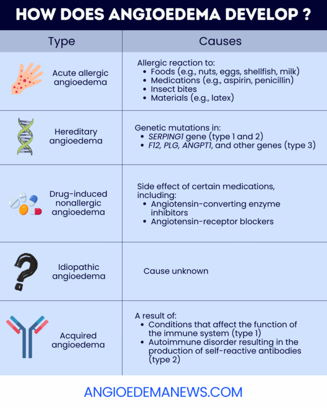 In rarer cases, angioedema can be caused by genetic mutations or an immune system malfunction. There are also instances of angioedema where the specific underlying cause is not known.